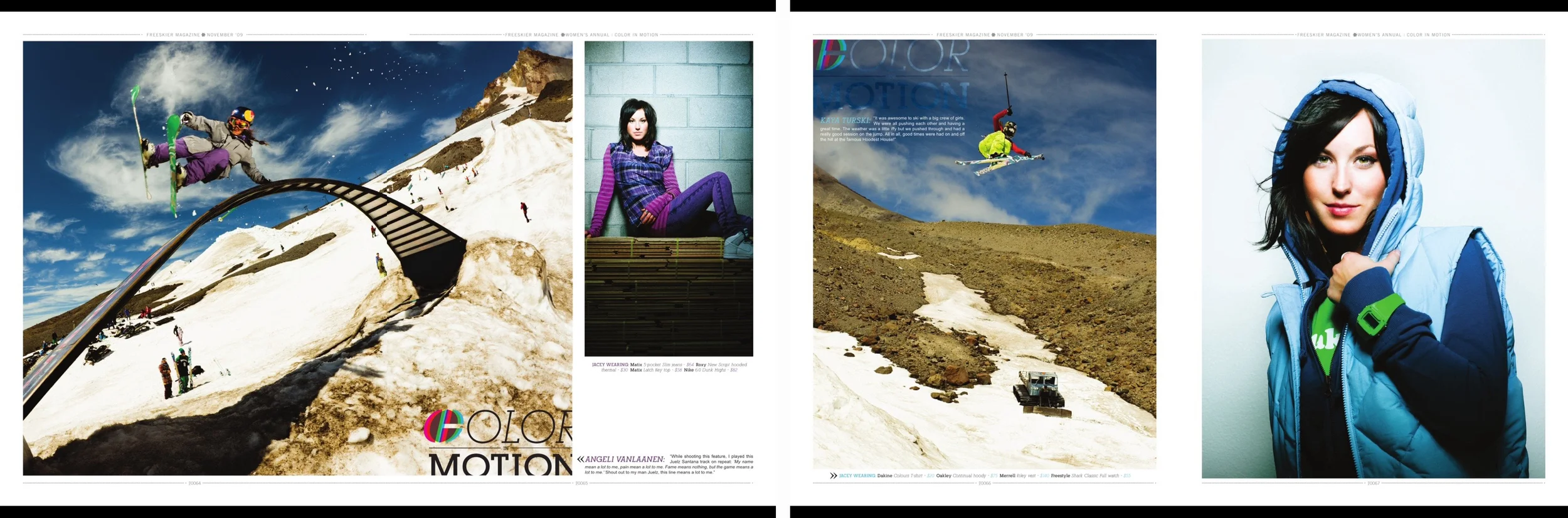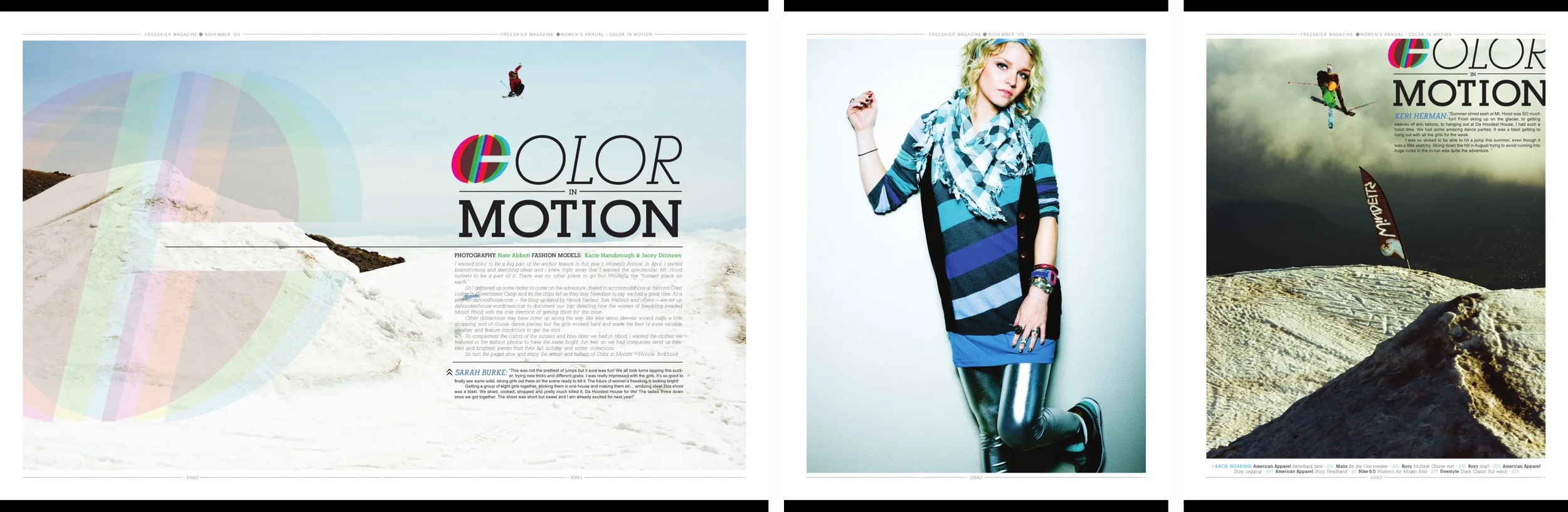 Color in Motion was a collaboration between female ski athletes and models. The idea was to pair professional skiers side by side on a page with models showing the colors of expression in both sports and fashion.